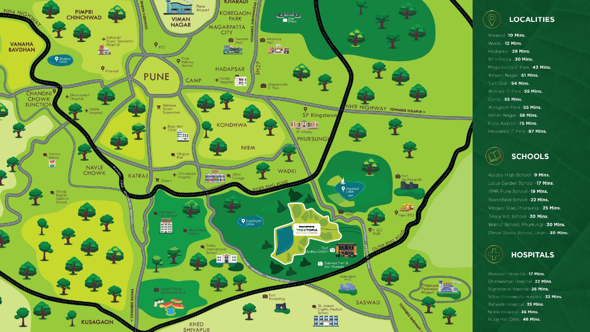 Treetopia is around 10 minutes from Saswad and Wadki and 30 minutes from SP Infocity
